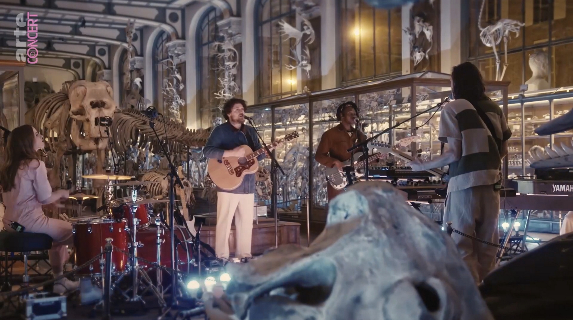 Die Band Metronomy präsentiert ihr neues Album Small World inmitten der Vitrinen und Skelette in der Galerie für Paläontologie und vergleichende Anatomie des Muséum National d’Histoire Naturelle.